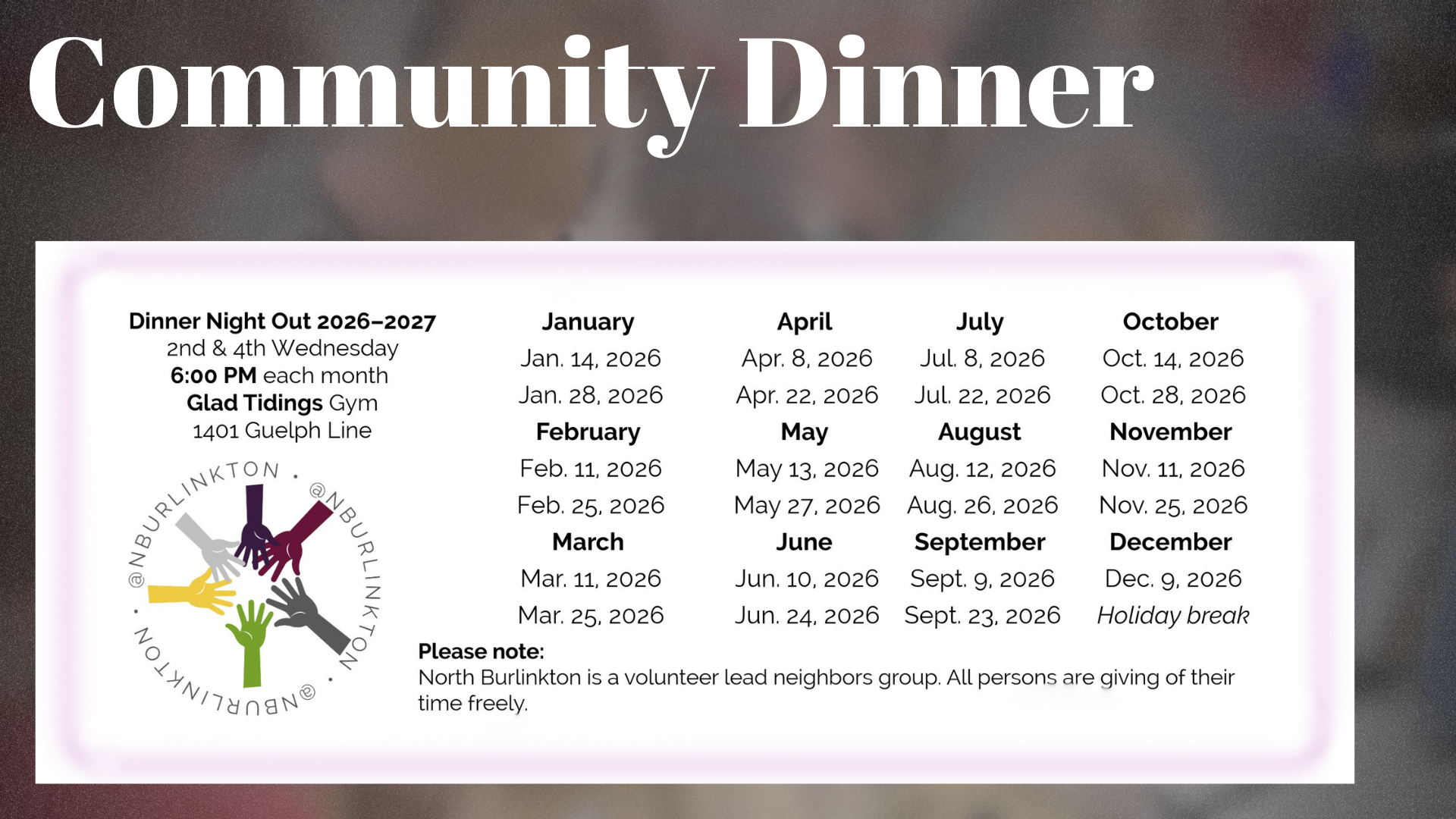 Together with North BurlinKton, we host a drop-in community dinner at 6PM on the 2nd and 4th Wednesday each month in our gym. Everyone is welcome. There is a place at the table for you! Drop by - no registration required!