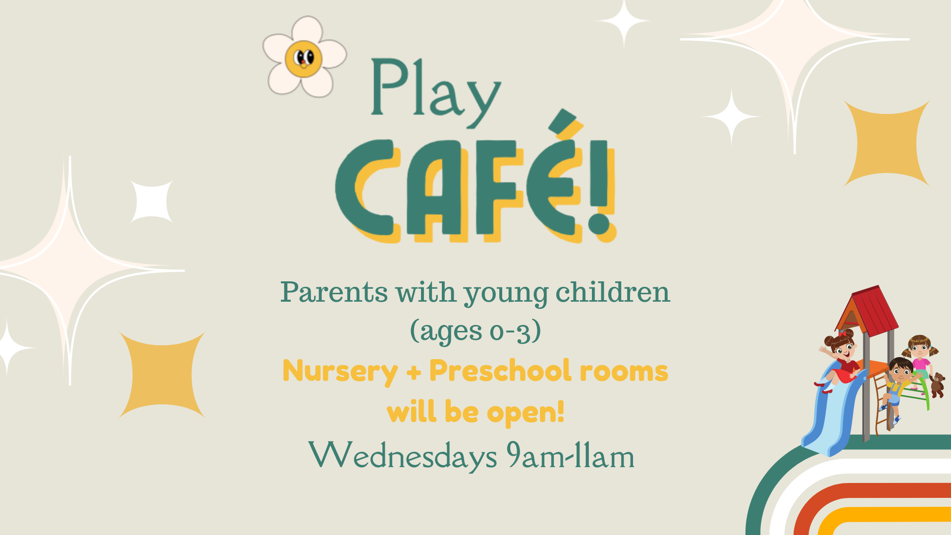 Parents with young children (ages 0-3) are invited to our Play Café hosted at Glad Tidings Church! Nursery & Preschool rooms will be open for unsupervised play and time connecting with other parents. Join us on Wednesdays from 9am-11am and invite your friends too!